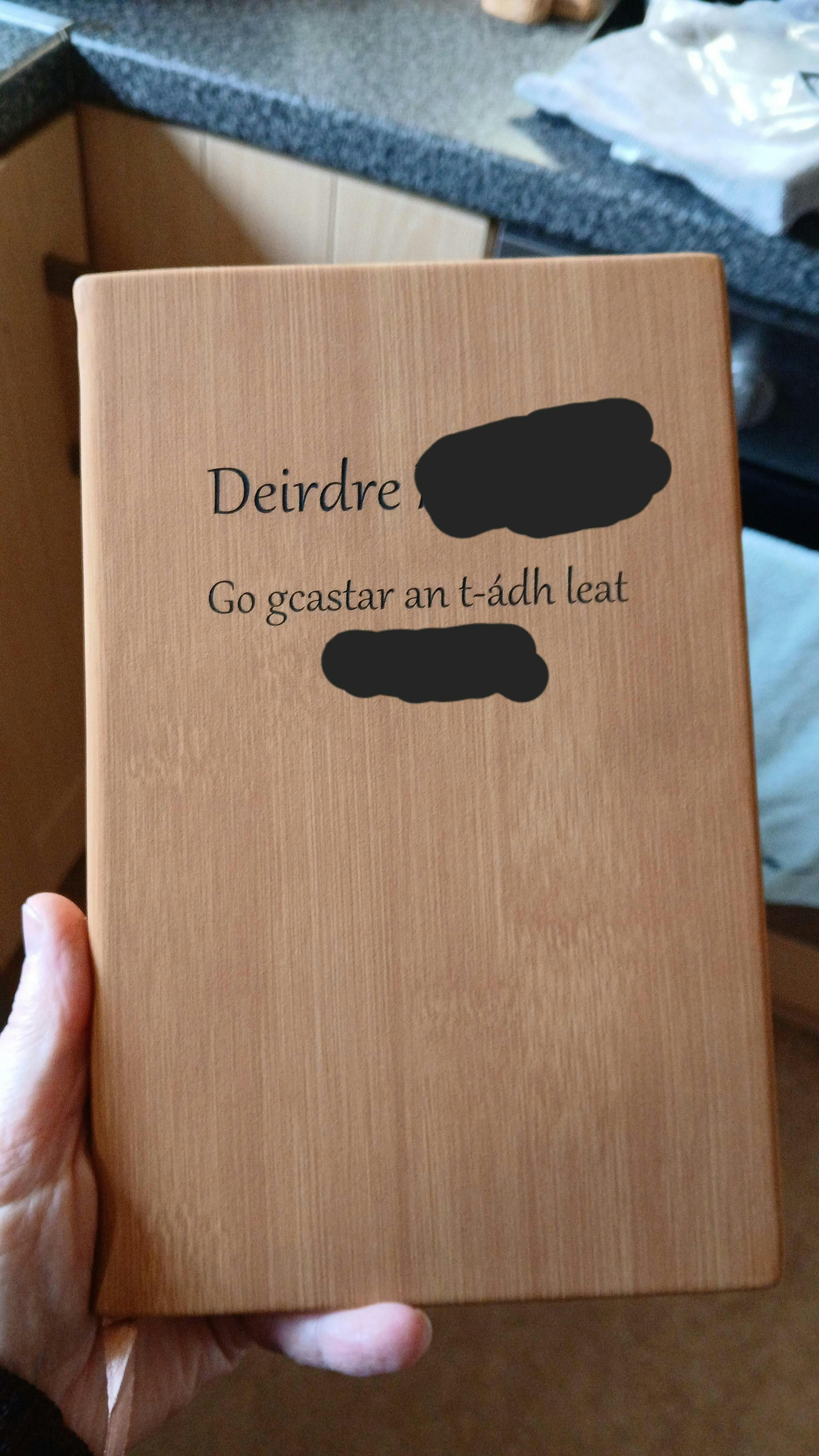 Each personalised Bamboo leather notebook is laser engraved here in Ireland in our base in Co. GalwayIf you have any questions, please feel free to get in touch with us and we'd be only happy to help.